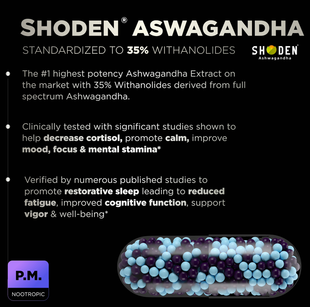 End your day with Shoden Ashwagandha, L-Theanine, Magnesium, GABA, and Apigenin to calm the mind, boost mood, and promote restorative sleep. Shoden, a potent Ashwagandha extract with 35% Withanolides, supports mental clarity, reduces fatigue, and enhances brain health.*