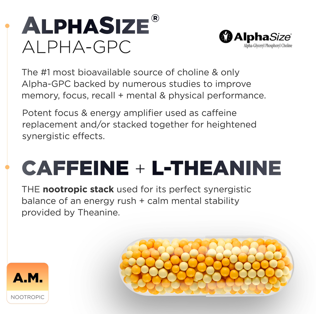 A synergistic blend of AlphaSize Alpha GPC, N-Acetyl L-Tyrosine, Caffeine, and L-Theanine for long-lasting focus, calm energy, and enhanced concentration. AlphaSize is clinically validated to improve memory, focus, and physical performance, outperforming other choline supplements.*